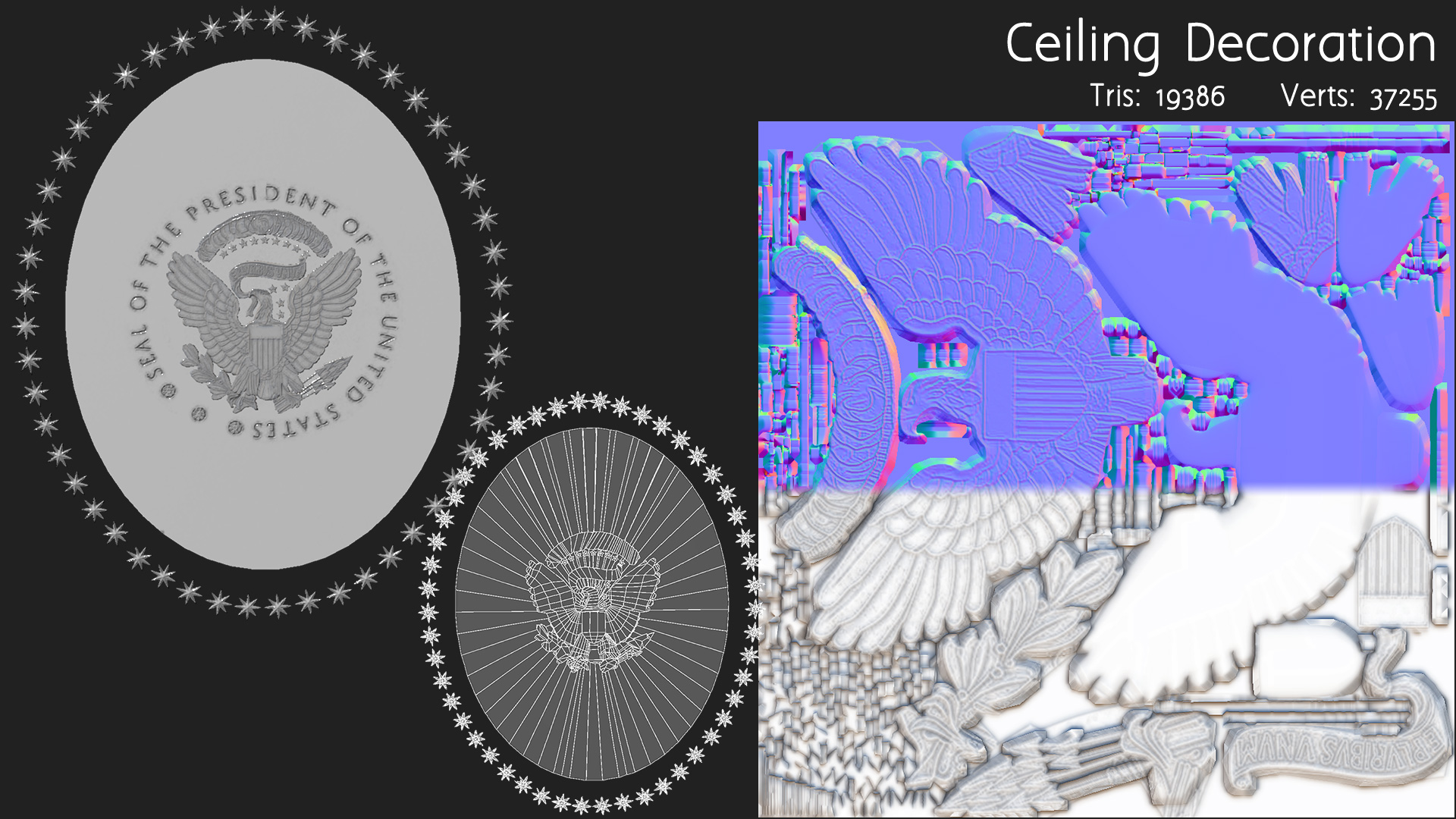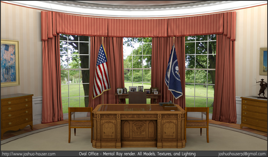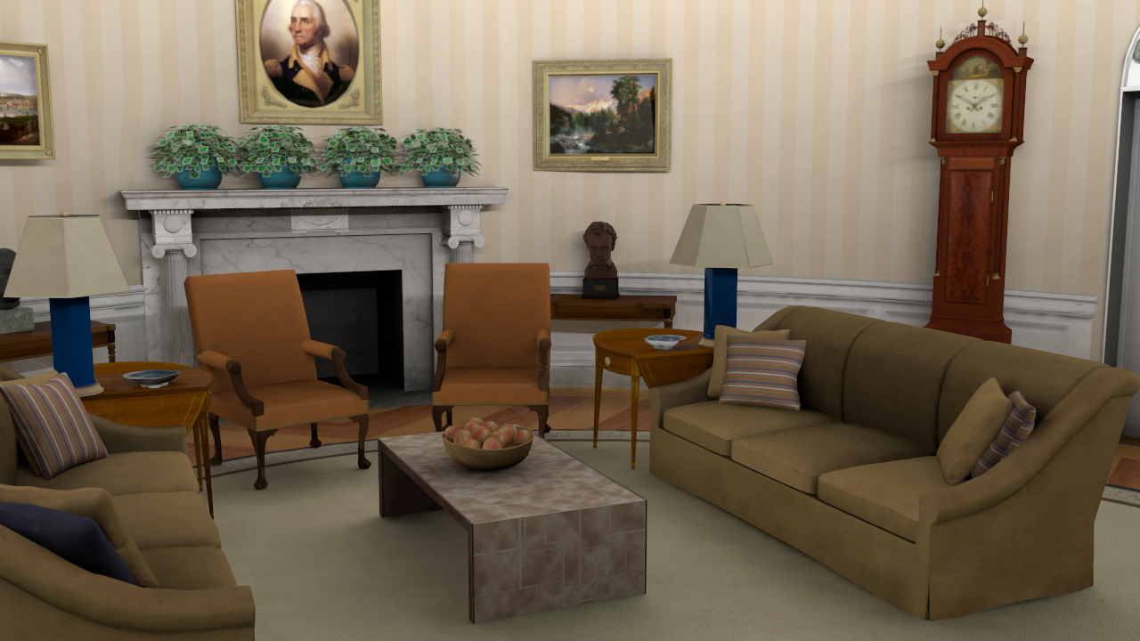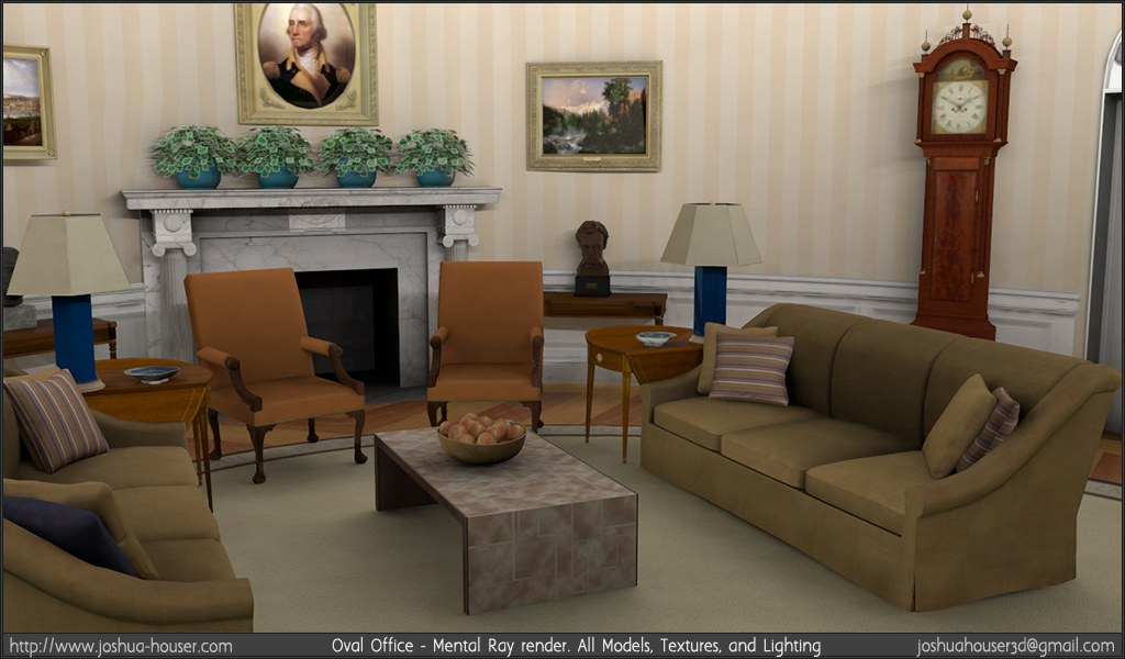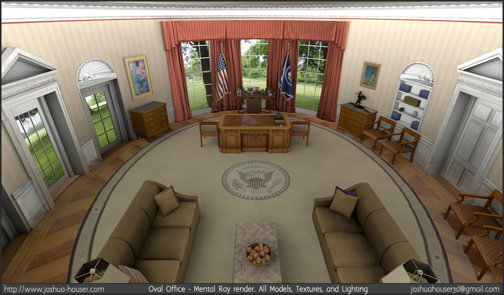 This is a recreation of the Oval Office as it appears after its redecorating on August 31, 2010. The office consists of over 40 different models using more than a hundred texture maps. Many of the models in this scene were created using a base-to-high, high-to-low workflow using Autodesk Mudbox for sculpting and Autodesk Maya for retopology as needed. Other skills, including rigging, skinning, and MEL scripting, were utilized for this project in order to easily position certain models or to quickly optimize my workflow. My goal with this project was to faithfully recreate a easily-recognizable location while studying various 3D modeling and texturing techniques.