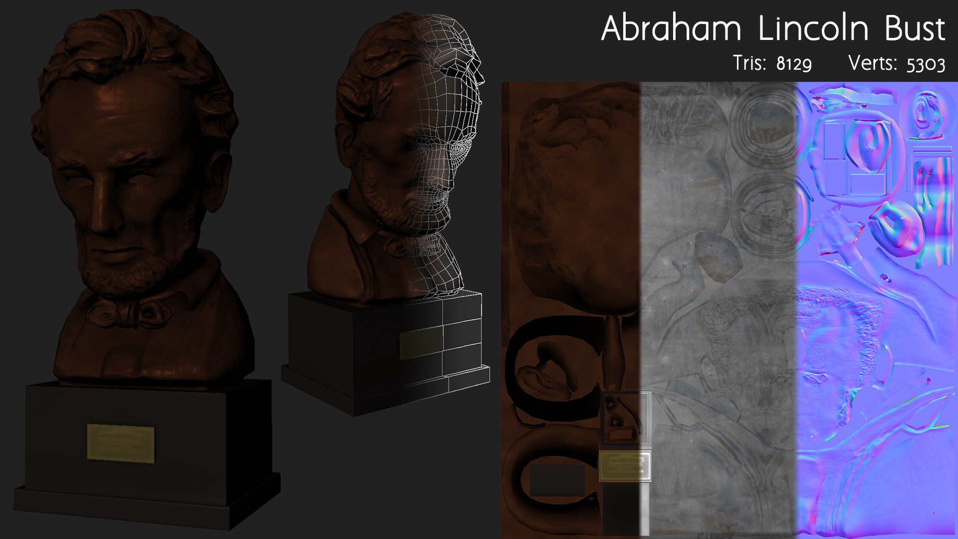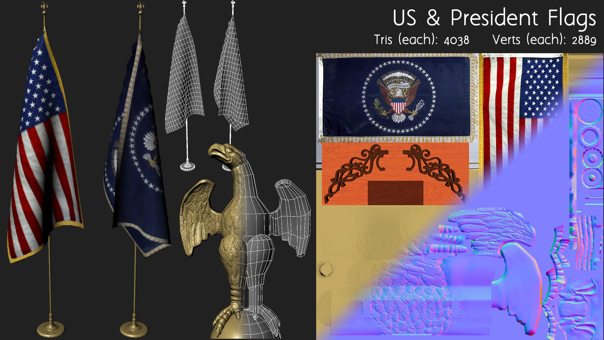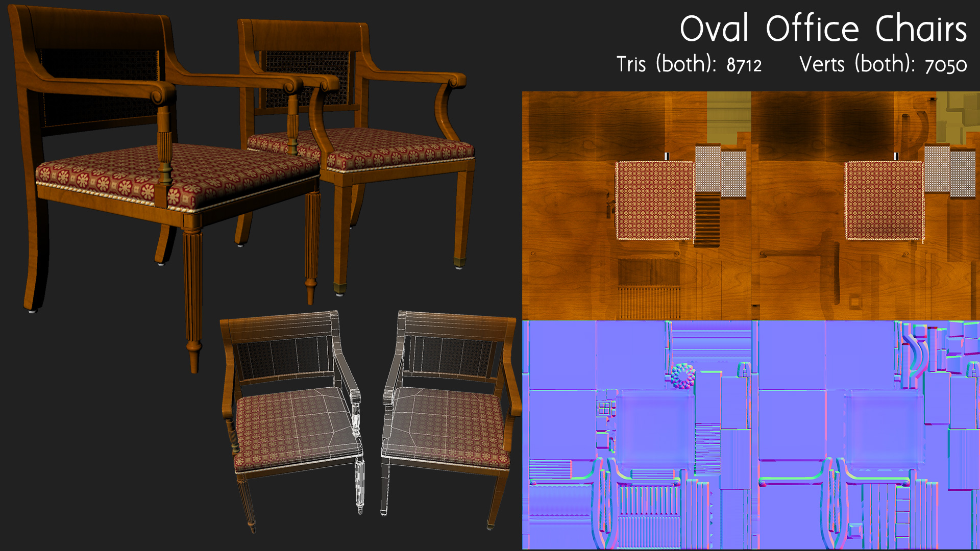This is a recreation of the Oval Office as it appears after its redecorating on August 31, 2010. The office consists of over 40 different models using more than a hundred texture maps. Many of the models in this scene were created using a base-to-high, high-to-low workflow using Autodesk Mudbox for sculpting and Autodesk Maya for retopology as needed. Other skills, including rigging, skinning, and MEL scripting, were utilized for this project in order to easily position certain models or to quickly optimize my workflow. My goal with this project was to faithfully recreate a easily-recognizable location while studying various 3D modeling and texturing techniques.